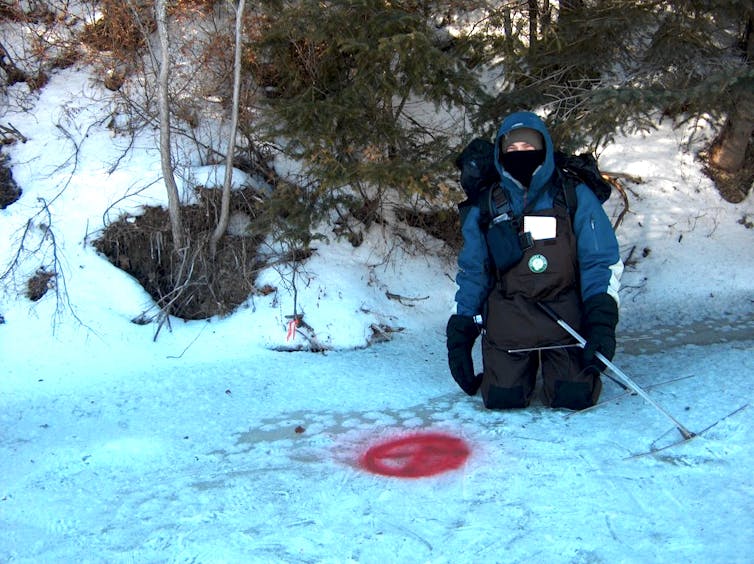 X marks the spot. Former graduate student Bill Greaves tracks turtles during a cold Ontario winter. Author provided