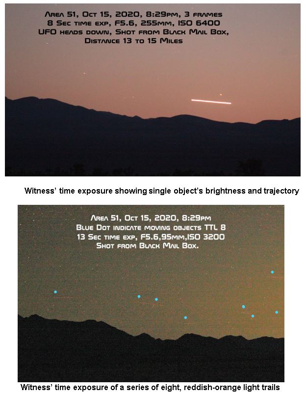 The 13-second time exposure (directly above) shows the trail of eight, straight trajectory, reddish-orange, pulsing lights. Each object is shown with a light-blue dot above it (to ease locating the faint series of lights). This was apparently taken with Bruce’s 95 mm lens. All images were taken from the Black Mail Box near Highway 375 (the “Extraterrestrial Highway”). Could these be civilian drones? Not likely. The entire region around Area 51 is a restricted, air space (i.e. a “no fly zone”). If they’re drones, they’re US military, not civilian.