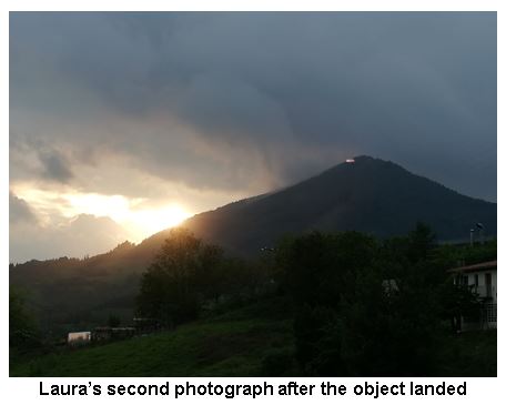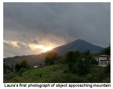 Zumarraga is 15 miles south of the Bay of Biscay and 25 miles southwest of San Sabastián, a port town in northern Spain. Laura was more than one mile away from the mountain shown in the photos below. She claims that a white object, at approximately 10° above the horizon, approached the mountain (apparently from the left in the photo) and then descended. The object proceeded to land on the mountaintop and then disappeared. According to her Case Management System report, she observed the object for “4 hours.” However, this was more likely due to a misunderstanding, and one might reasonably assume that she meant “4 minutes.” Laura took two photographs of the object: one as the object approached the mountain and a second photo after the object landed. The object was silent throughout the event.